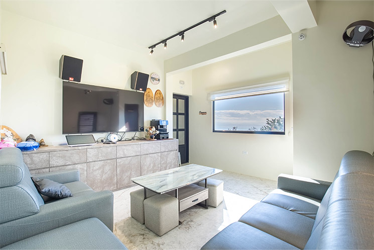 小島包棟民宿,每間房間有獨立衛浴空間,大廳面海提供電動麻將桌、KTV、咖啡機、冰箱和飲水機讓旅客使用。